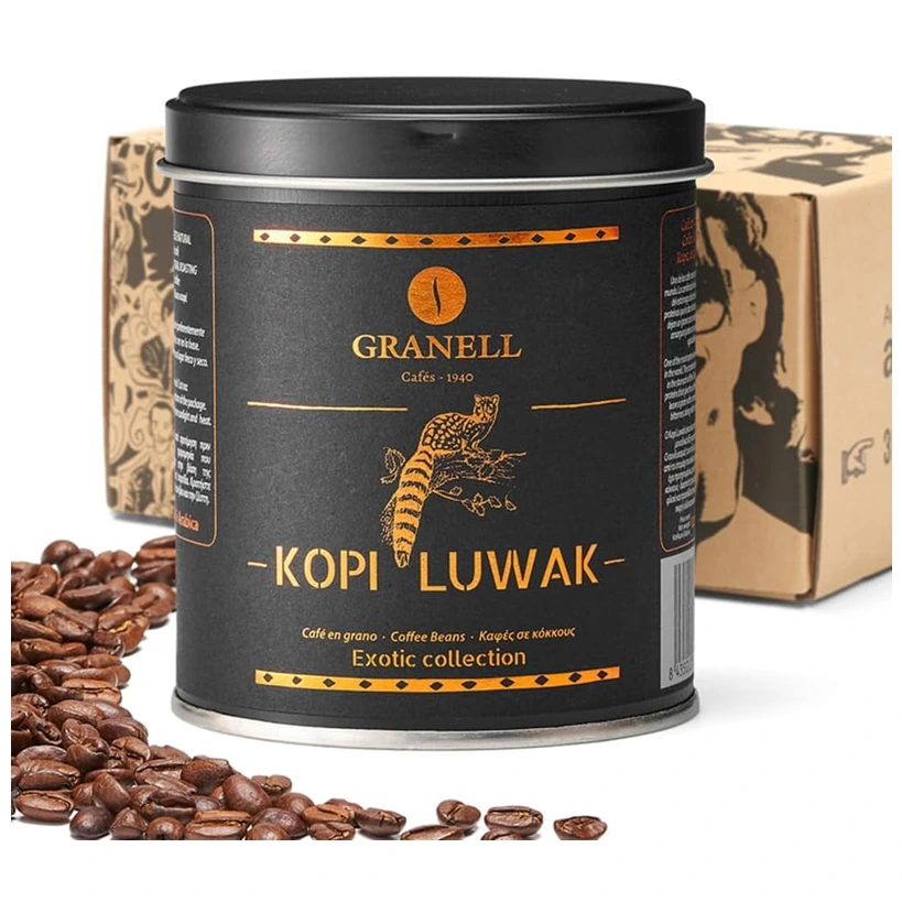 Kopi Luwak, the world’s most exclusive and expensive coffee! Crafted with meticulous care and sustainably sourced, this extraordinary blend is unlike any other. Raw whole bean, and you need a coffee machine for it. Produced by Granell Cafés – Wild Kopi Luwak Caffeinated Coffee – Sustainably Sourced from Indonesia – 100grams