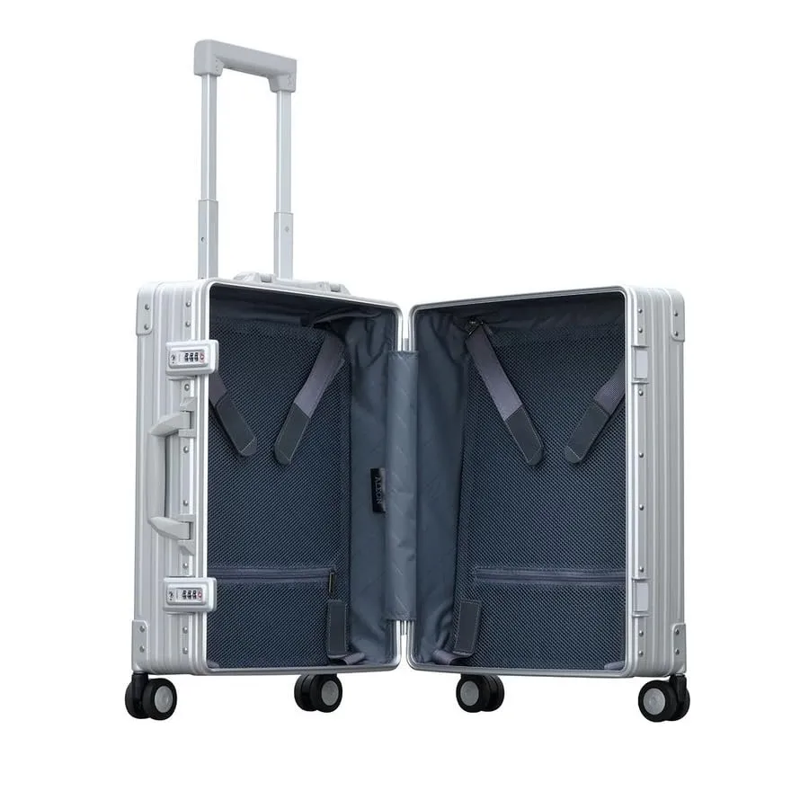 The authenticity and luxury of the ALEON Aluminum Carry-On Suitcase. This high-quality 21-inch luggage, crafted from durable aluminum, features TSA-secured locks and spinner wheels for effortless travel. The hard shell design ensures your belongings are protected, while the spacious interior offers ample room for all your essentials. Airline approved and designed for modern travelers, this suitcase combines luxury and authenticity with high-quality craftsmanship, making it the perfect travel companion for any journey.