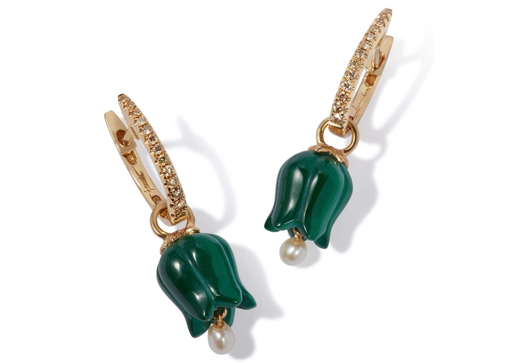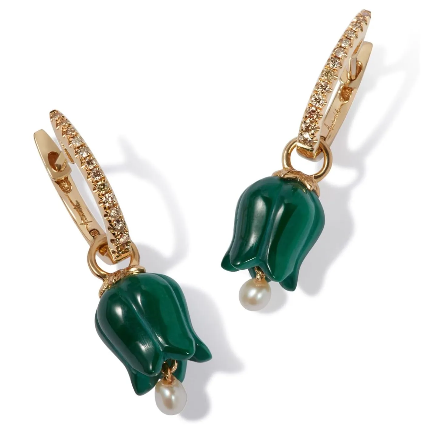 Discover the beauty of Annoushka’s Tulip Malachite Earring Drops, crafted in 18ct Yellow Gold. These exquisite earrings feature high-quality malachite (2ct), freshwater pearls (0.25ct), and brown diamonds, blending elegance and style. Perfect for any occasion, they add a touch of sophistication and timeless charm to your jewelry collection. Embrace the allure of these stunning pieces and elevate your look with their unique design and impeccable craftsmanship.