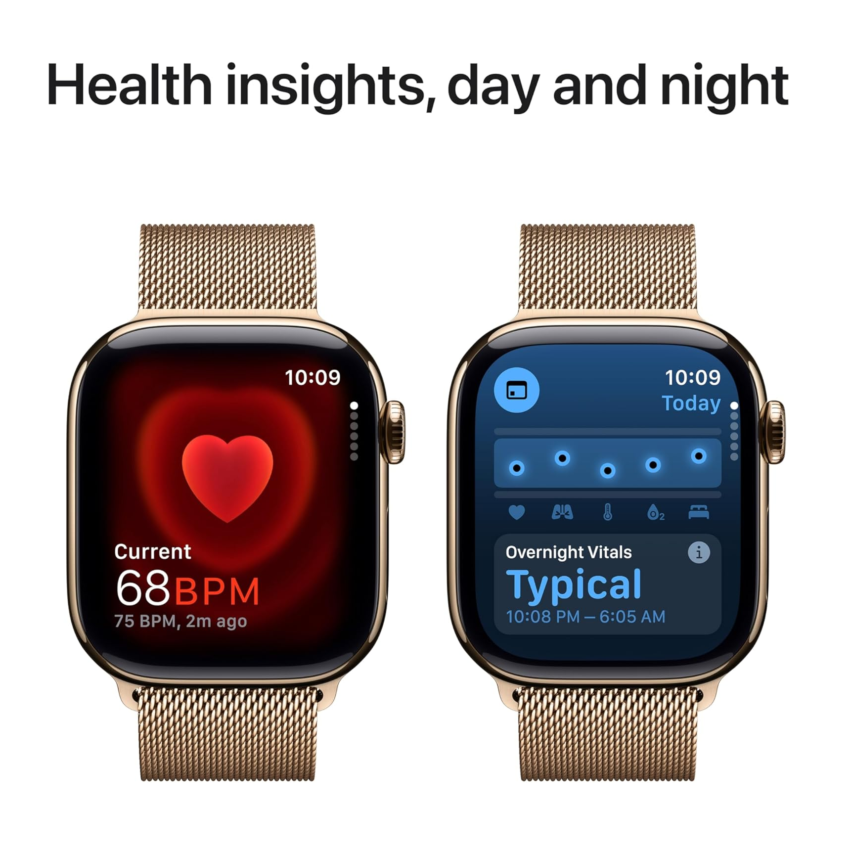 - ADVANCED HEALTH INSIGHTS — Take an ECG at any time.* Get notifications if you have high or low heart rate or an irregular heart rhythm.* Understand your menstrual cycle and get retrospective ovulation estimates.* See overnight health metrics like heart rate, respiratory rate and more with the Vitals app.* Track sleep and get notifications if Apple Watch detects signs of sleep apnoea.*