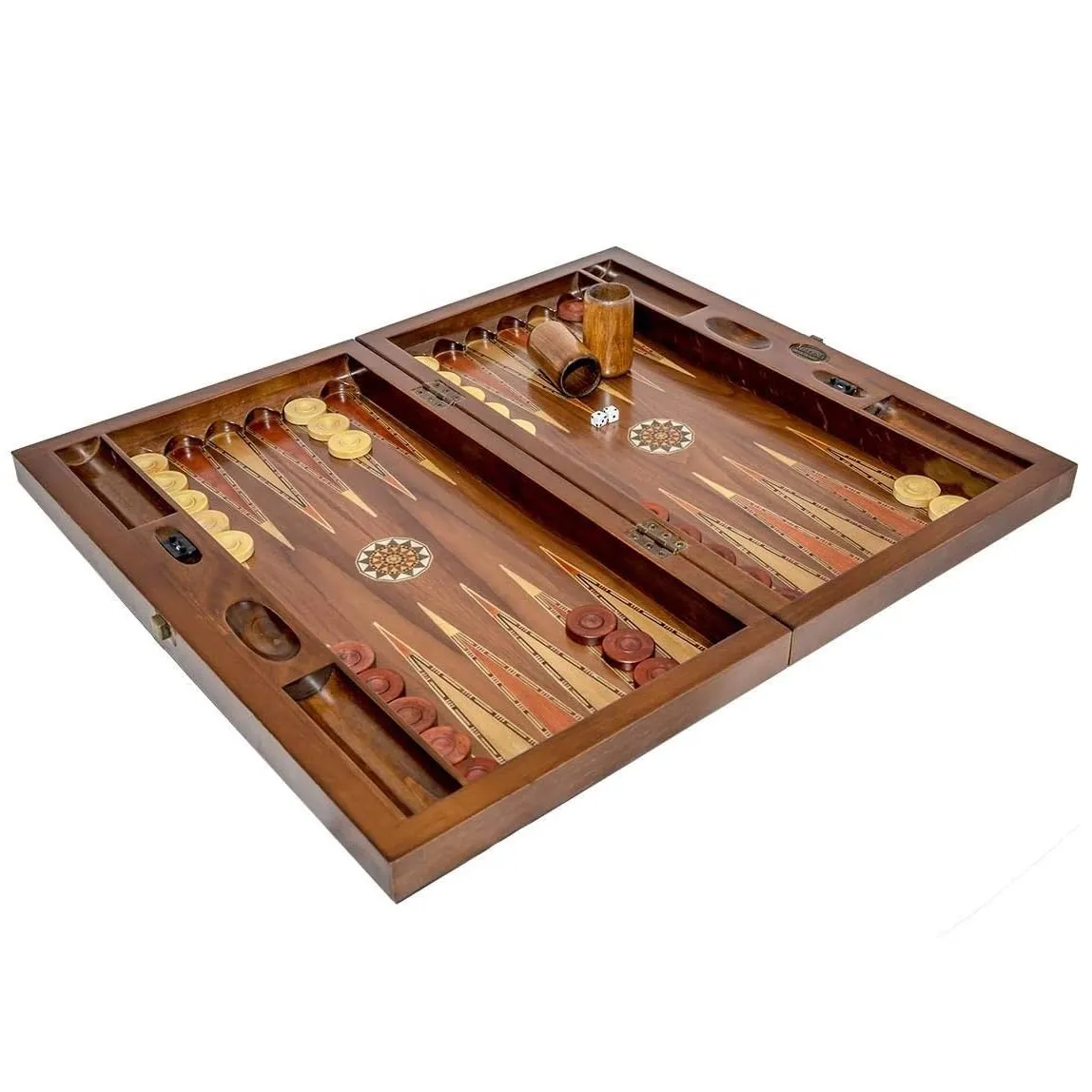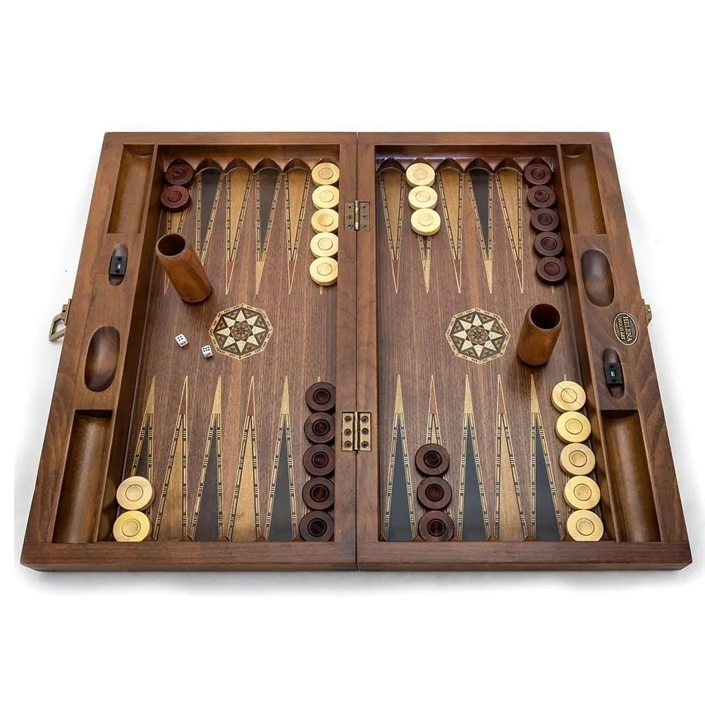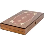 Beautifully hand crafted with high-quality walnut wood, this classic Backgammon set features a unique handmade mosaic design (no print). The dimensions are 20.5″ x 12″ x 3.15″ (52 cm x 30 cm x 8 cm). The set includes the Backgammon board, playing chips, playing dice, dice shakers, and a convenient carrying bag. Whether you’re a seasoned player or new to the game, this foldable Backgammon set is perfect for hours of strategic fun!