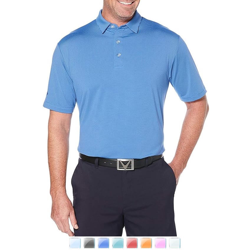 CALLAWAY AUTHENTIC GOLF Men’s Short Sleeve Fine Line Stripe Polo Shirt. This stylish polo features a fine line stripe pattern and is available in multiple colors, including Peacoat and Aruba Blue. Crafted from a blend of polyester and elastane, it offers a comfortable stretch and moisture-wicking properties to keep you dry on the course. The built-in sun protection shields you from harmful UV rays, while the classic fit ensures a full range of motion. Perfect for any golfer, this polo combines performance and style, making it a must-have for your wardrobe