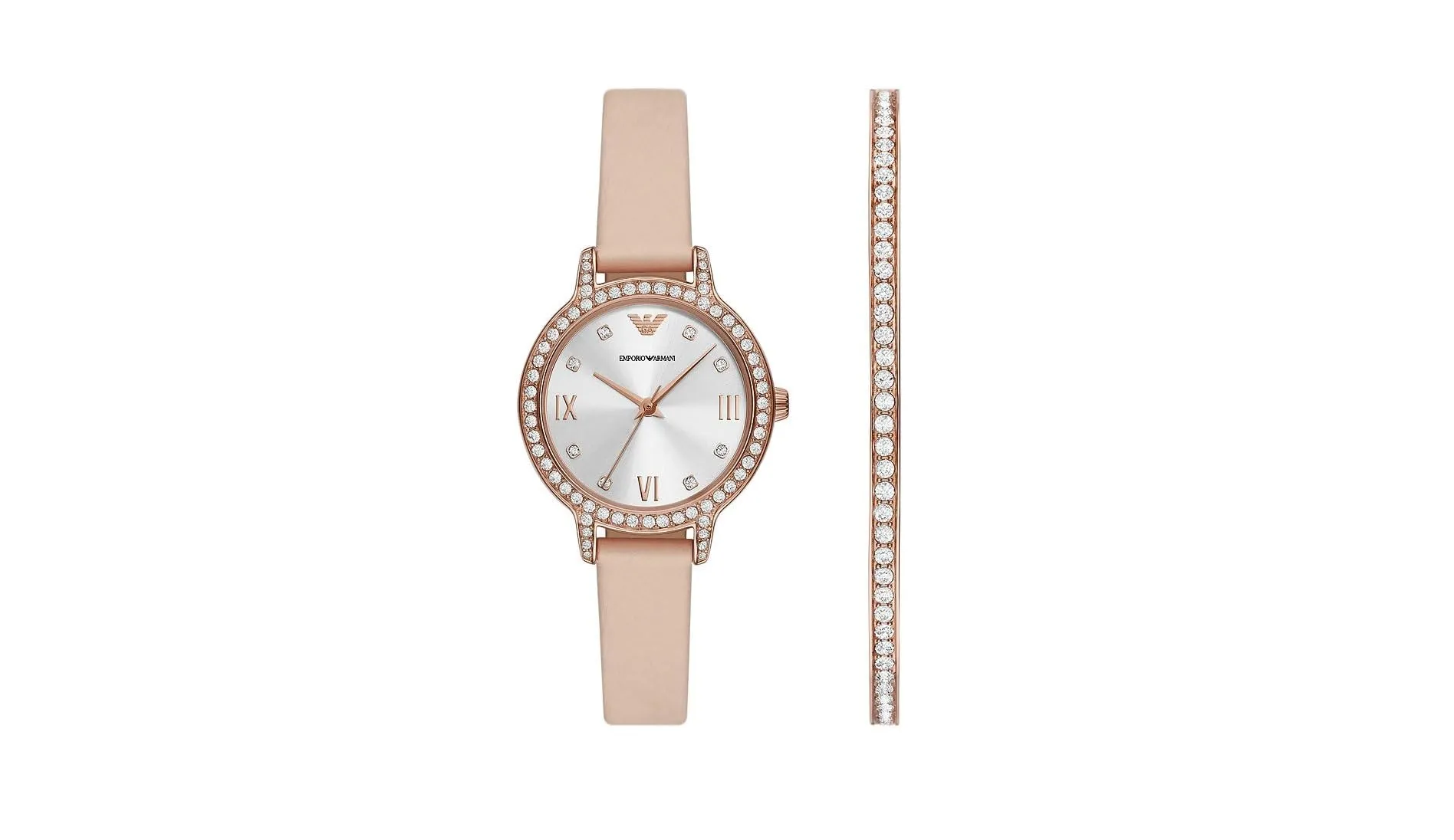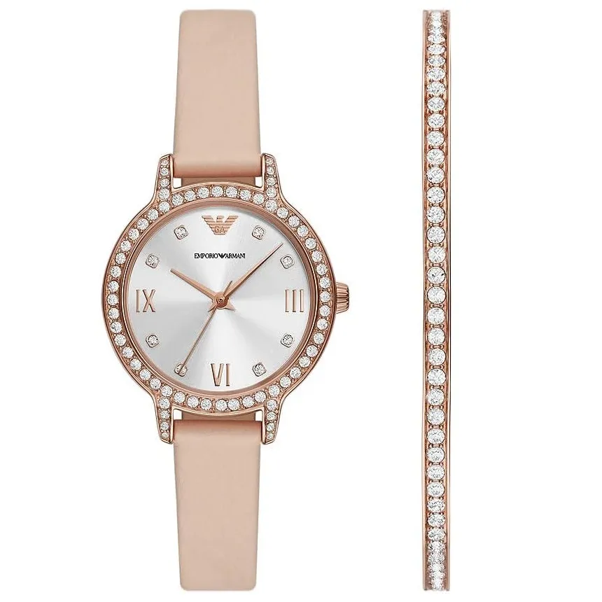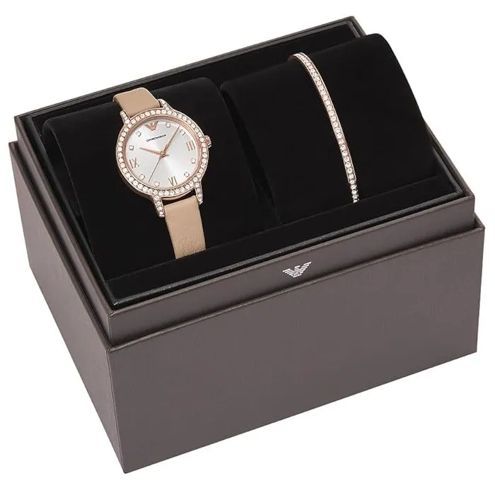 Elevate your elegance with the Emporio Armani 2 Piece Luxury Jewelry Set. This exquisite set features a rose gold-tone stainless steel wristwatch and a matching bracelet, embodying luxury, quality, and style. The three-hand watch showcases impeccable craftsmanship, while the bracelet adds a touch of sophistication. Perfect for any occasion, this set is a testament to Emporio Armani’s commitment to timeless design and superior quality. Indulge in the ultimate blend of style and luxury.