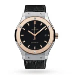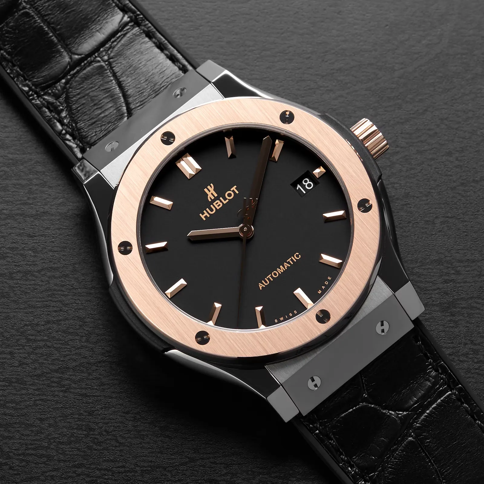 The Hublot Classic Fusion collection reinterprets classic elegance and luxury with Hublot’s incomparable touch. Crafted in 18kt king gold, this timepiece features a mat black dial with king gold-tone hands and index hour markers. The fixed 18kt king gold bezel adds a touch of sophistication. It’s a resolutely unique style, available in a wide variety of movements, designs, materials, and colors. The watch also includes a date display at the 3 o’clock position. Whether you’re dressing up for a special occasion or making a statement every day, the Classic Fusion embodies Hublot’s “Art of Fusion” to perfection.