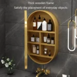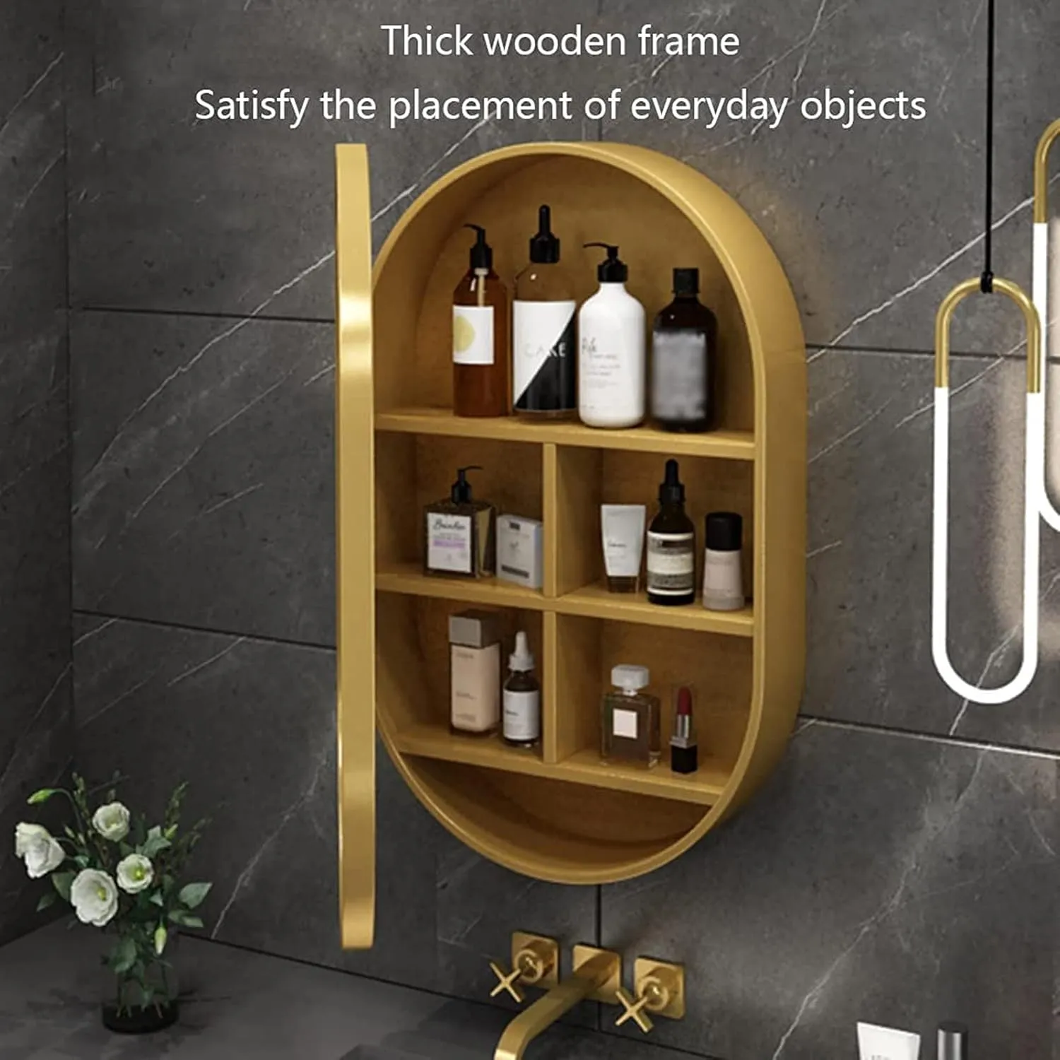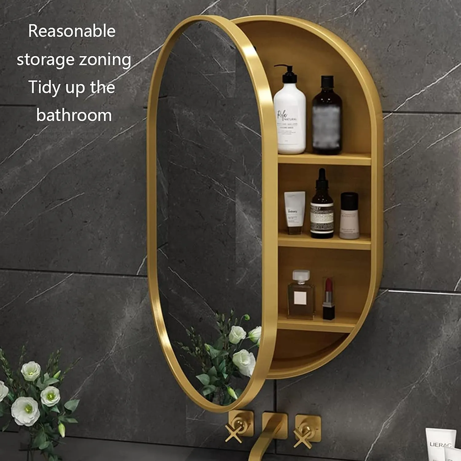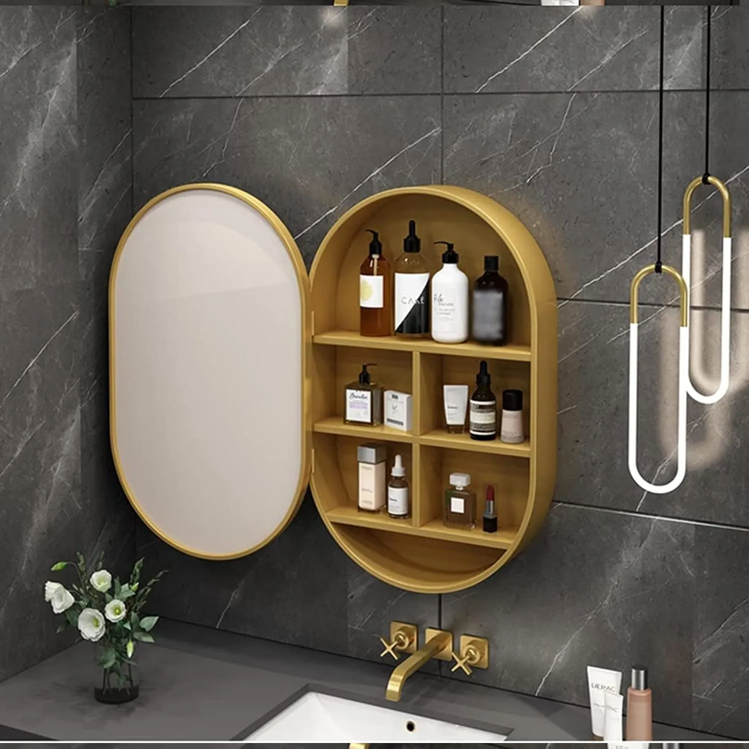 A 2 in 1 Mirror Cabinet. Oval Bathroom Cabinet with Mirror Door, Wall-Mounted lockers, Home Vanity, Simplicity, and Unique Style, Gold 50x80x14cm. Produced and marketed by Kunming Shating Trading Co., Ltd.