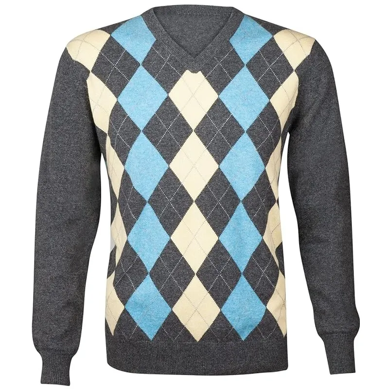 LONA SCOTT – LUXURY Men’s 100% Cashmere, TOP QUALITY, V-Neck Jumper 2-Ply – Argyle