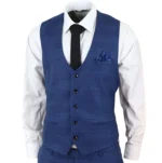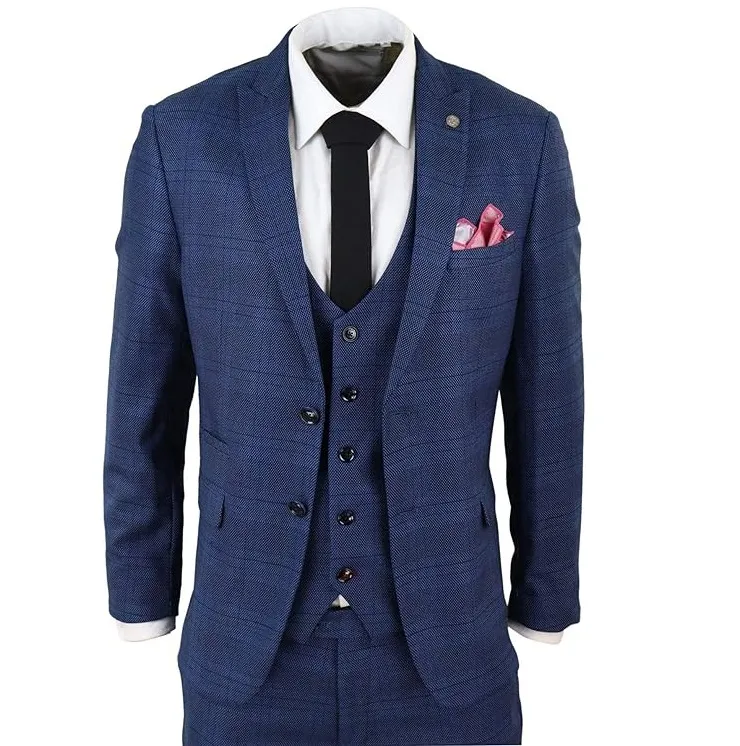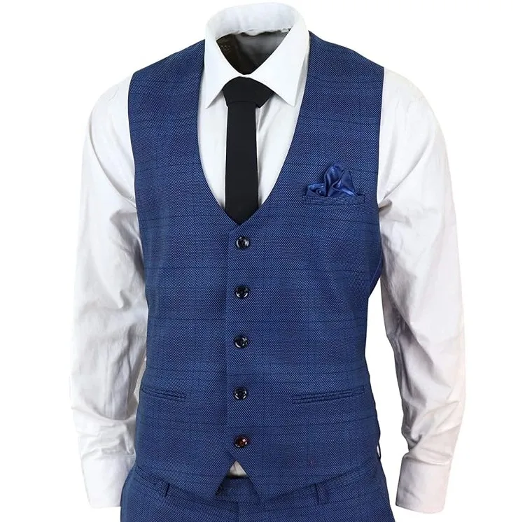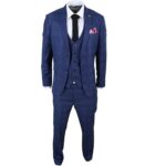 MARC DARCY – LUXURY Men’s 3 Piece Suit Blue Prince of Wales Black Check Vintage Retro. This suit exemplifies craftsmanship and authenticity, with a tailored fit that ensures a sophisticated silhouette. The Prince of Wales check pattern in blue and black herringbone tweed radiates timeless style. Each element, from the blazer to the waistcoat and trousers, reflects meticulous attention to detail. Perfect for the discerning gentleman, this suit is more than just attire; it’s a statement of elegance and refinement. Elevate your wardrobe with this exquisite piece, blending tradition and modernity seamlessly.