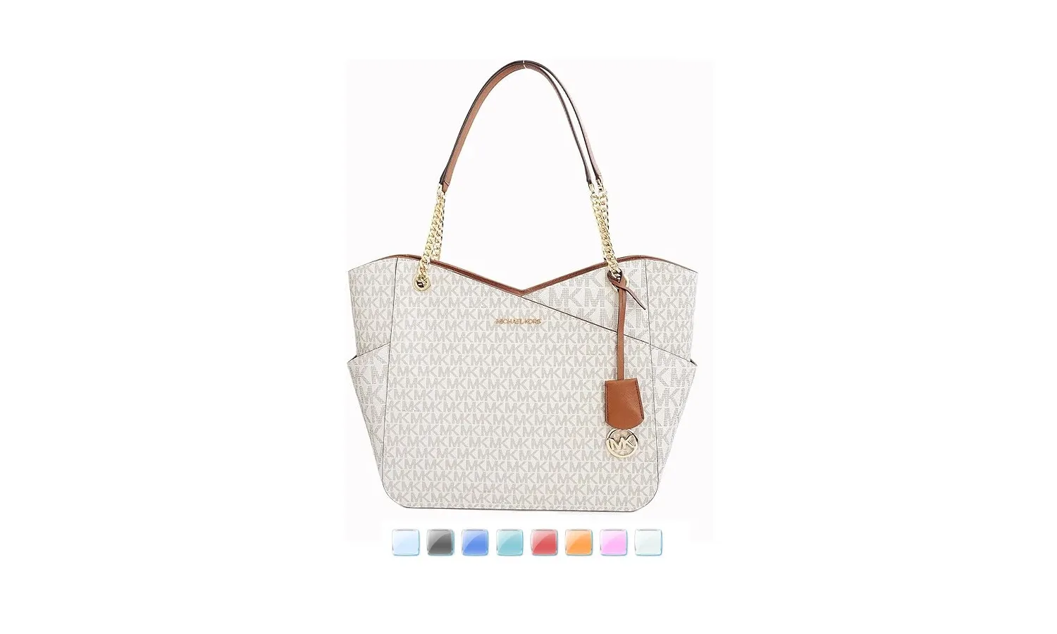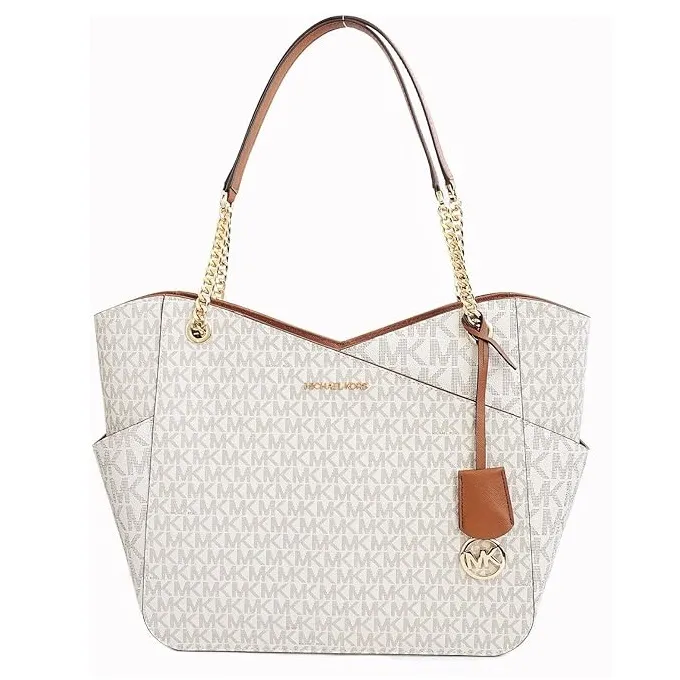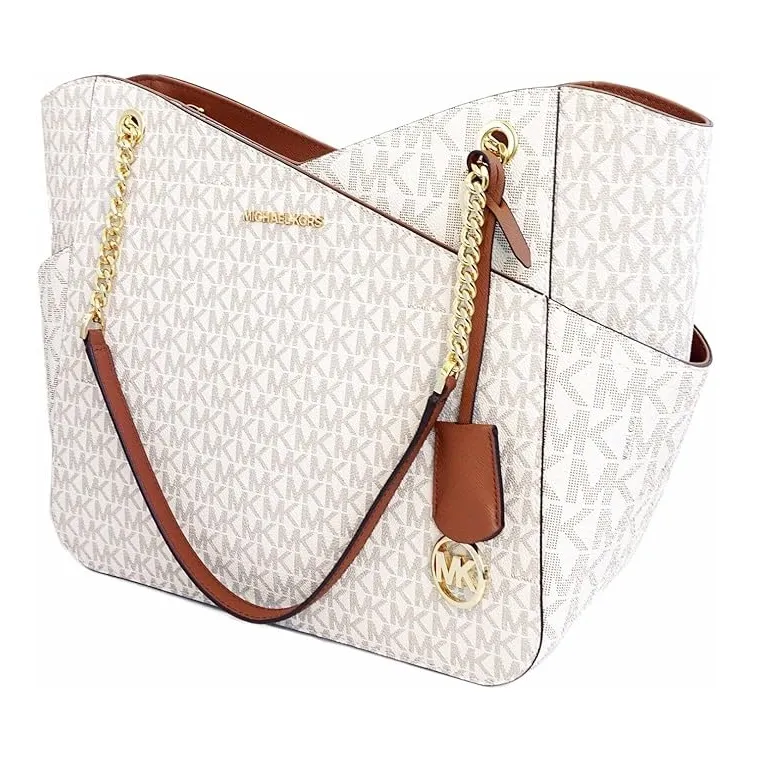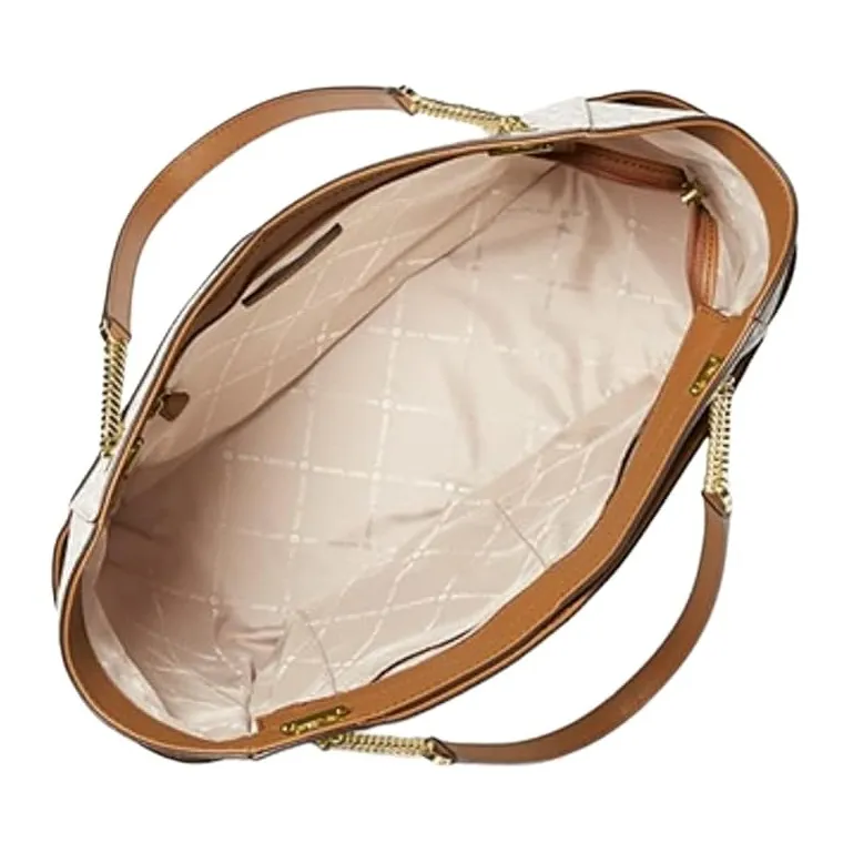 The MICHAEL KORS LUXURY Jet Set Travel Large Chain Shoulder Tote in Vanilla MK Signature. This top-quality tote exudes sophistication and style, crafted from premium materials for a luxurious feel. The spacious interior and elegant chain shoulder straps make it the perfect blend of practicality and chic design. Whether for a day out or a special occasion, this tote is your ultimate accessory for a touch of refined elegance.
