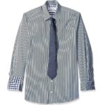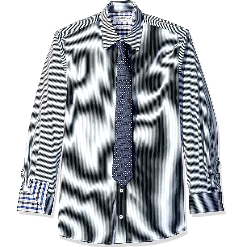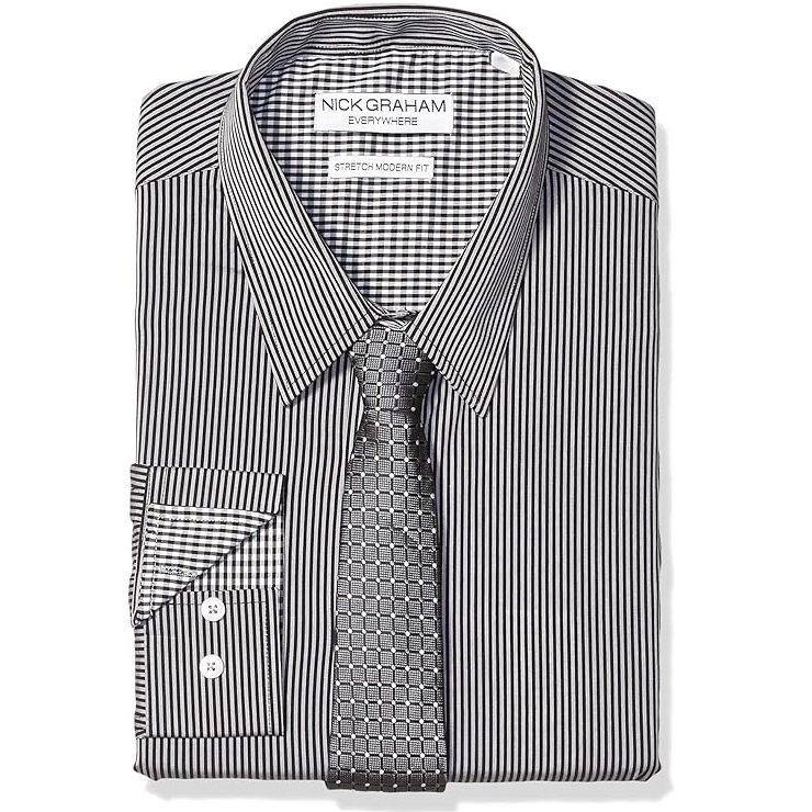 Nick Graham Men’s Stretch Modern Fit Stripe Shirt and Dot Grid Tie Set! Crafted with premium quality and a touch of luxury, this ensemble combines tradition, attitude, and pure fun. The shirt features a modern fit, contrast details, and convenient choices for work or play. The 2-7/8″ wide tie complements the look perfectly, adding sophistication to any outfit. Elevate your style with Nick Graham – where confidence looks good!
