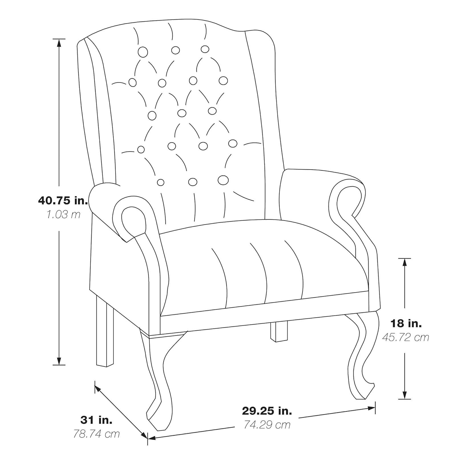Overall Size: 29.25” W x 31” D x 40.75” H; Seat Size: 18.75” W x 19.5” D x 8” T; Back Size: 22.75” W x 23.25” H x 7.75” T – Approved for commercial use