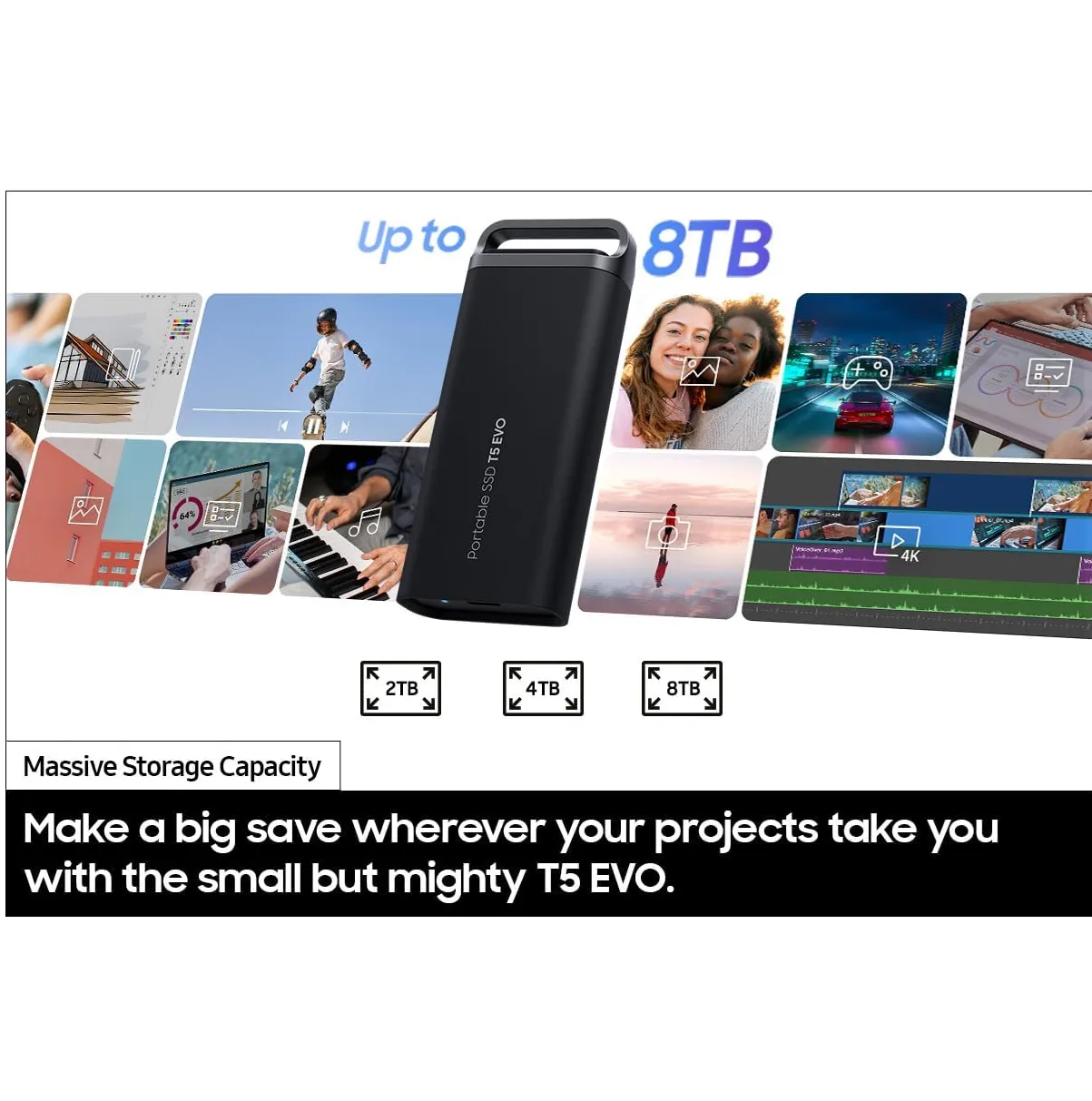 - CAPACITIES THAT KEEP UP: Make a big save wherever your projects take you with the small but mighty T5 EVO; It’s light enough to take anywhere and comes with capacities of 2TB to 8TB, making it an easy way to store more on-the-go