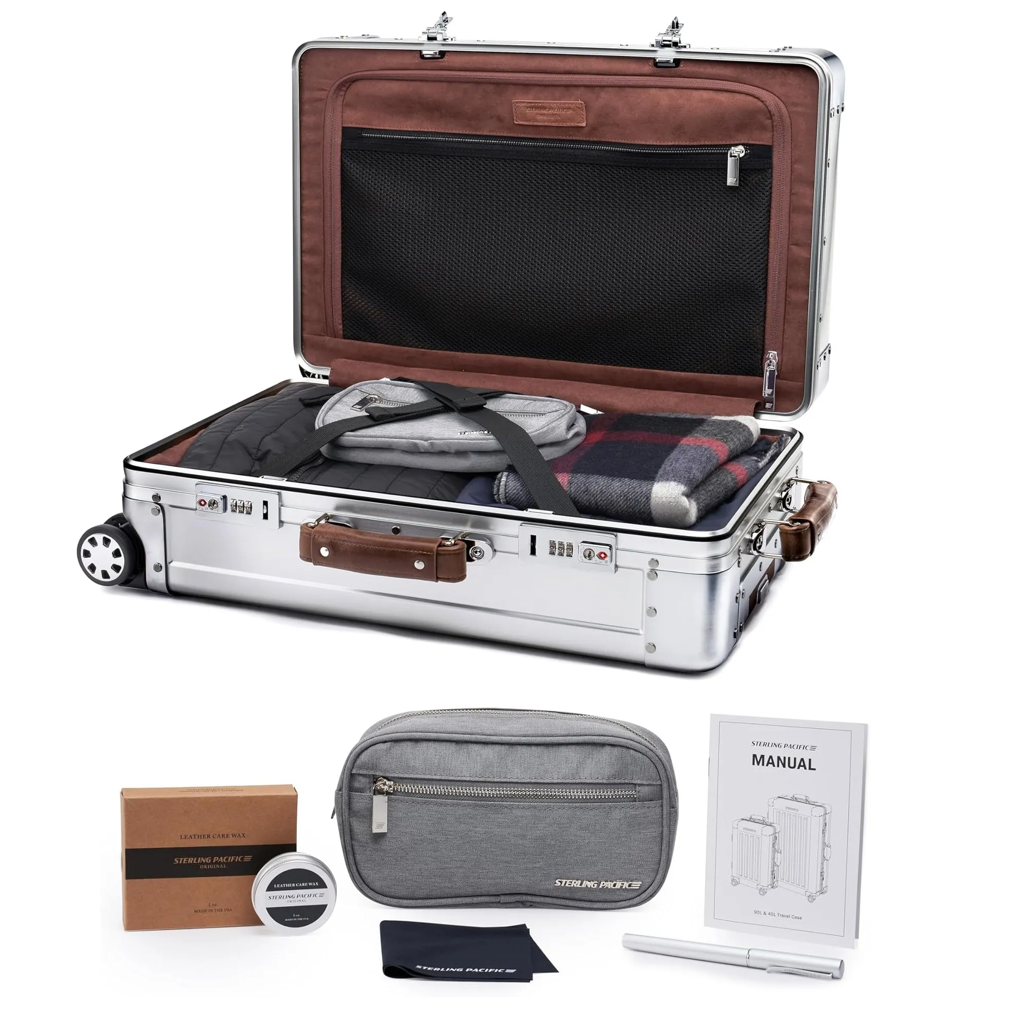 The epitome of luxury with Sterling Pacific’s PROTECTIVE Deluxe Aluminum Air-Travel Luggage. Crafted from solid aluminum, this 40L cabin luggage ensures your belongings are protected throughout your journey. Featuring a TSA code lock, it offers enhanced security and peace of mind. Travel in style and confidence with this premium, durable luggage designed for the discerning traveler who values both elegance and protection.
