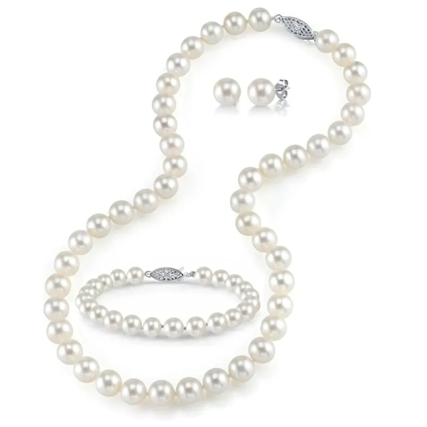 Experience the pinnacle of luxury with The Pearl Source 14K Gold Pearl Jewelry Set. This exquisite collection features a Freshwater Pearl Necklace, matching Earrings, and a Pearl Bracelet, all crafted with genuine cultured pearls. Each piece showcases AAA quality pearls, ensuring exceptional luster and flawless finish. Designed for the modern woman, this set combines timeless style with unparalleled quality, making it the perfect addition to any elegant wardrobe. Elevate your look with this sophisticated ensemble.