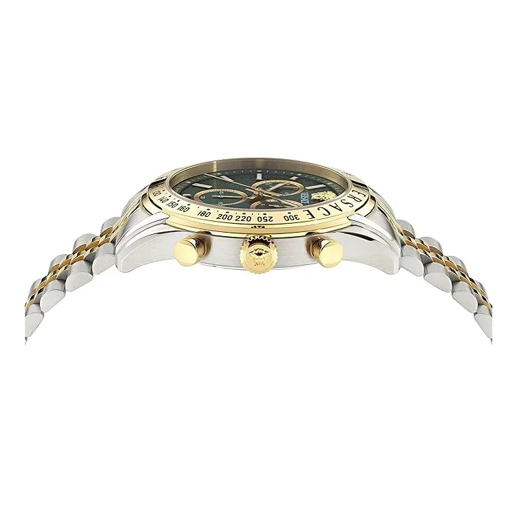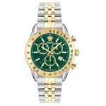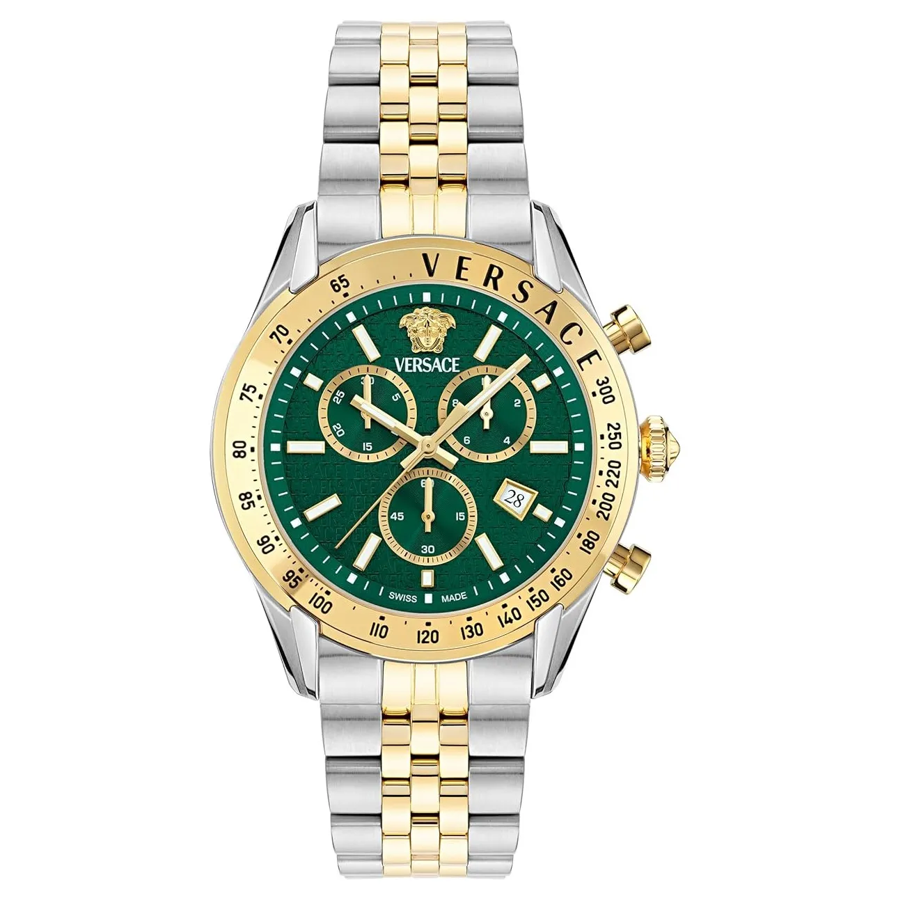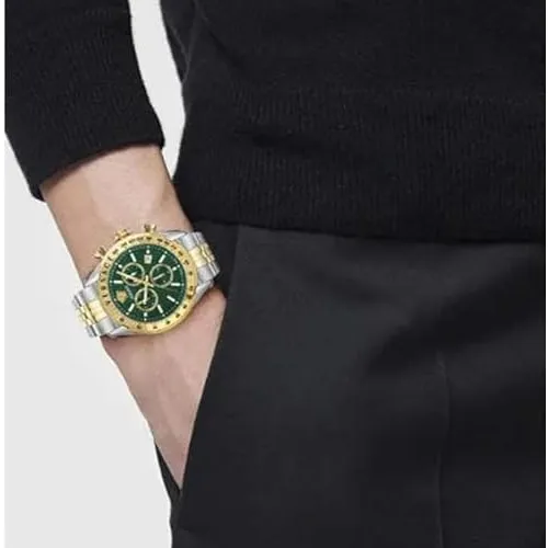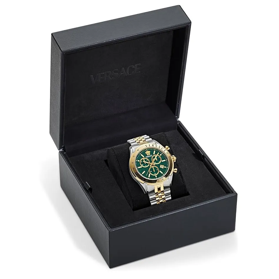 “Elegance meets precision in the VERSACE VE8R00524. Crafted with meticulous attention to detail, this timepiece boasts a 44mm two-tone stainless steel case adorned with a bold logo and numbers on the top ring. The green dial features Versace’s signature logomania guilloché, while the chronograph movement and date window at 4 o’clock add functionality. With a sporty yet sophisticated design, this watch seamlessly combines luxury, style, and class—a true statement piece for the modern lifestyle.”