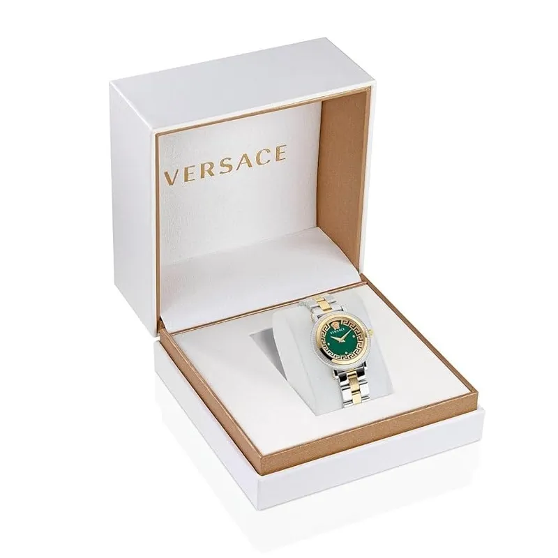 Elegance personified, the VERSACE VE7F00523 captures attention with its Swiss Made precision. The 36mm gold-tone case houses a captivating green guilloché dial, exuding sophistication. The multicolored stainless steel strap adds flair, secured by a deployment clasp. Water-resistant up to 5 bars, this watch balances luxury and functionality. Weighing 104g, it’s a statement piece that seamlessly blends luxury, style, and class.”