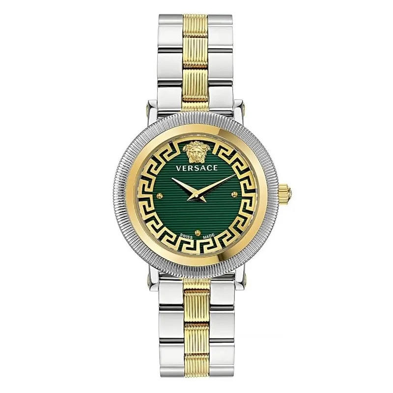 Elegance personified, the VERSACE VE7F00523 captures attention with its Swiss Made precision. The 36mm gold-tone case houses a captivating green guilloché dial, exuding sophistication. The multicolored stainless steel strap adds flair, secured by a deployment clasp. Water-resistant up to 5 bars, this watch balances luxury and functionality. Weighing 104g, it’s a statement piece that seamlessly blends luxury, style, and class.”