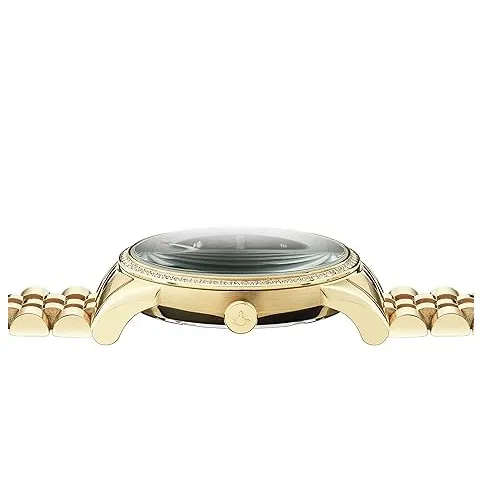 The Wallace watch in gold-tone stainless steel features a polished finish and a classic silhouette. Inspired by the Wallace Collection interiors, it displays a debossed, jacquard-etched dial, and a Swarovski crystal-set bezel. The green face, powered by quartz movement, showcases tonal hour markers and an Orb-detailed dial. Crafted from 100% stainless steel, the Wallace watch combines style and sophistication.