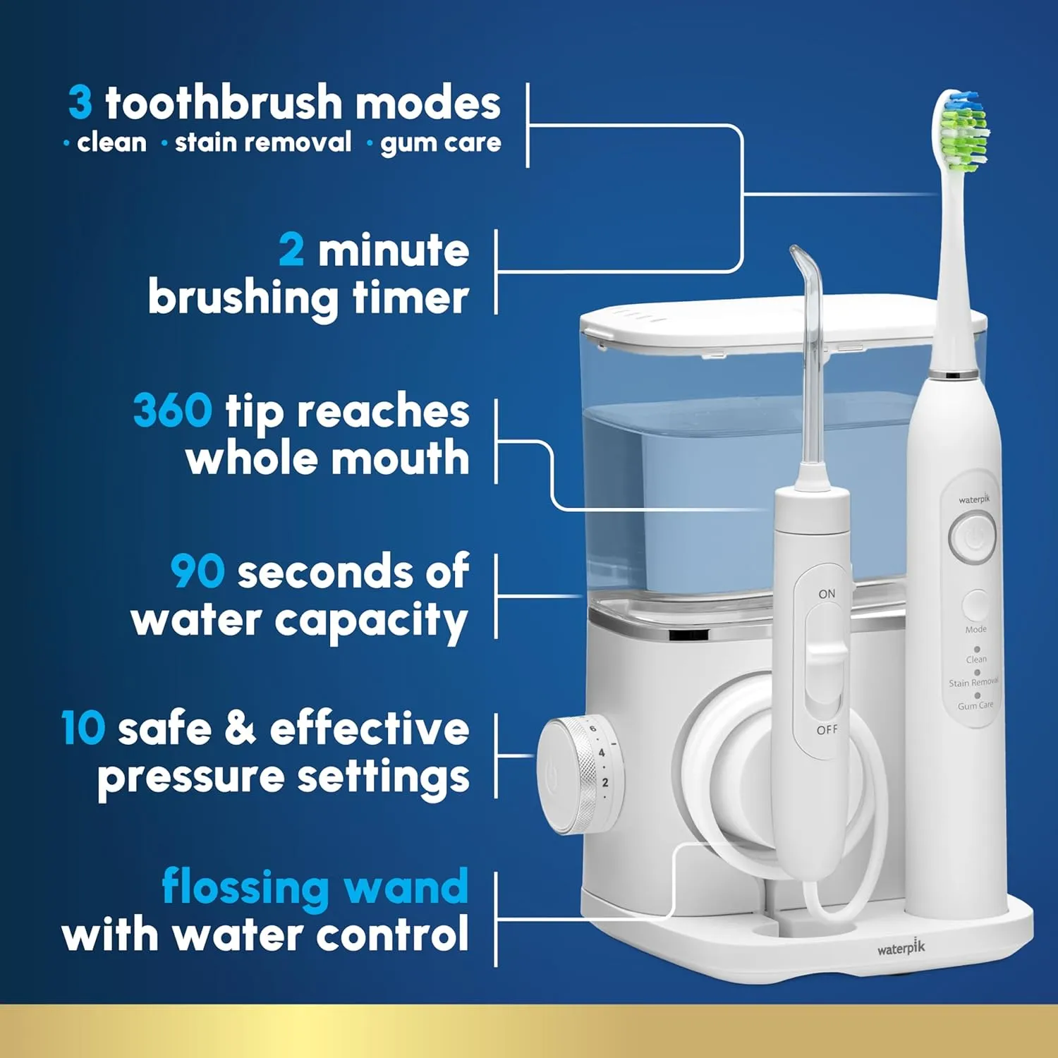 - ONE DEVICE, CUSTOM EXPERIENCE: The Waterpik water flosser provides 10 safe and effective settings and 5 specialty tips, and the rechargeable Sensonic electric toothbrush offers 3 modes (Clean, Stain Removal, Gum Care) to thoroughly clean tooth surfaces.