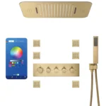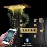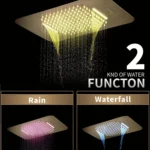 Shower Heads: 22.7*14.9 inches size ceiling mounted install. It is not only rainfall, waterfall function water outlet design , also have speakers, can use your phone’s bluetooth connect the shower’s bluethooth,play your favorite music. Shower heads have led strip, enjoy the fun of lighting changes. Mobile Phone, Touch Screen, Remote control can control 64 light colors