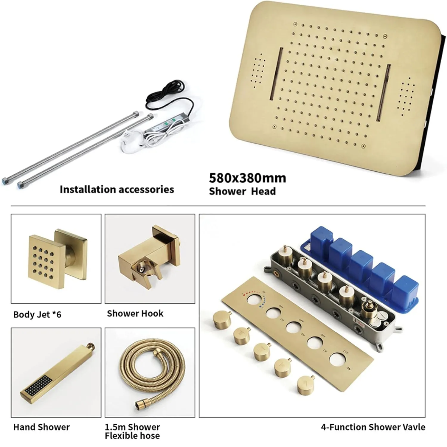This is an LED Music Shower Set, Including Stainless Steel Rain Shower Head, Brass Hand Shower Head, Thermostatic Shower Valve, 6 Side Spray, Hose and Accessories, providing fantastic water flow and one-time Pleasant experience. It is elegant and powerful, with excellent high or low water pressure performance