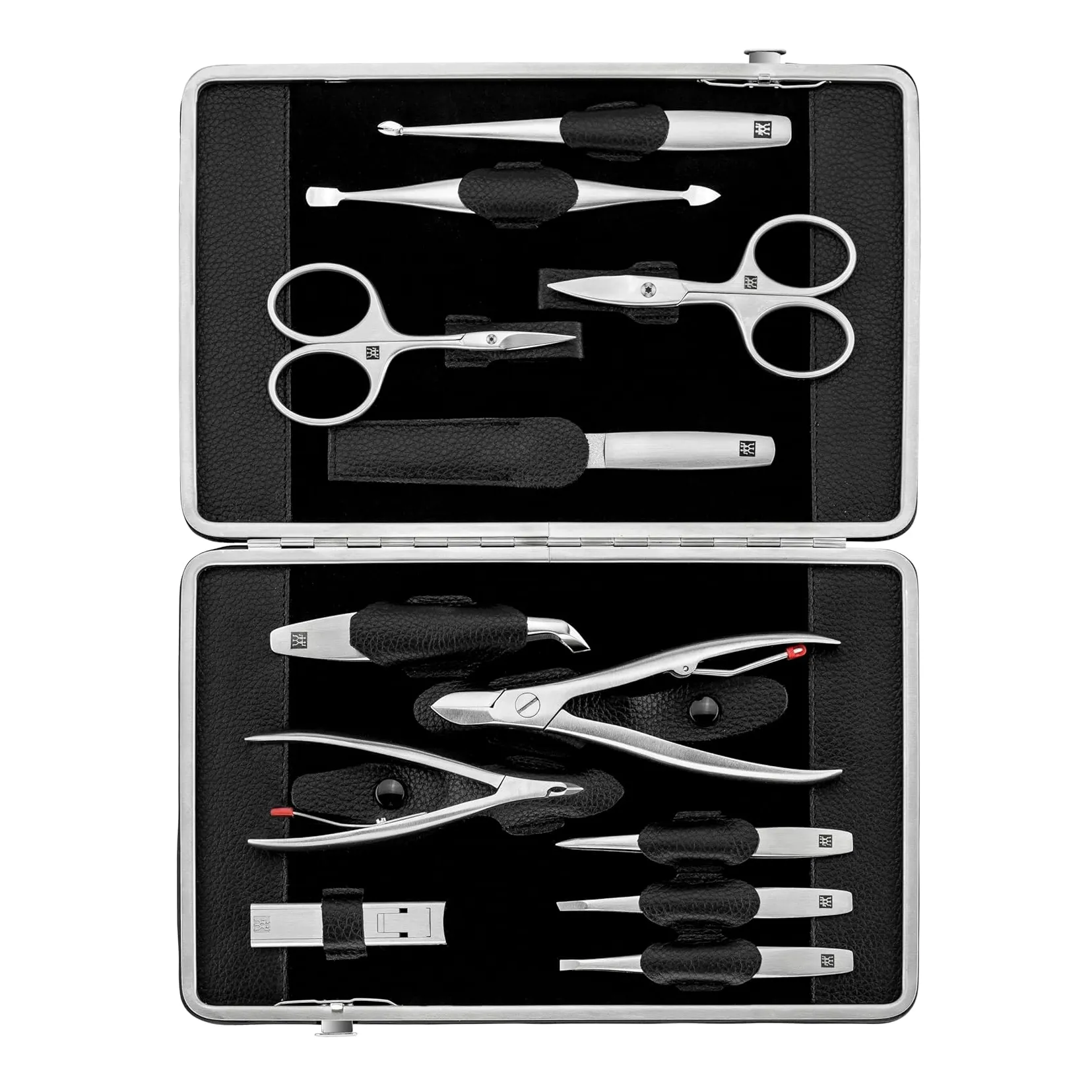 PACKAGE INCLUDES: includes nail scissors, cuticle scissors, TWIN S nail clippers, nail clippers, cuticle nippers, cuticle trimmer, sapphire nail file, cuticle knife, 2 in 1 manicure instrument, slanted tweezers, pointed tweezers and one straight tweezers